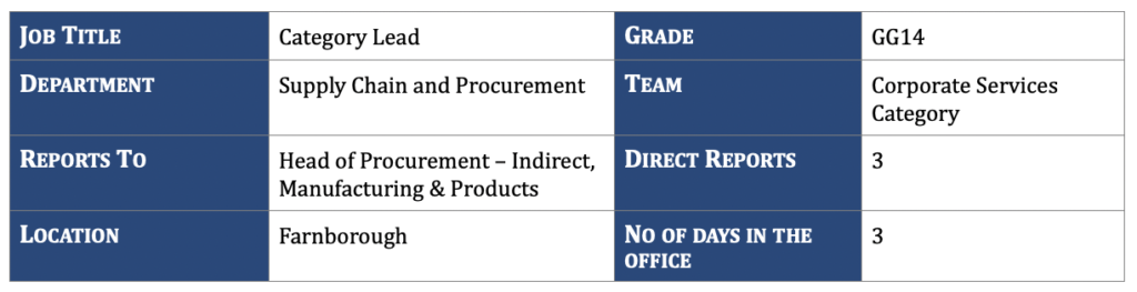 The Corporate Services Category has a spend of £100m across key categories including HR, Recruitment and Training, Professional Services, Legal, Marketing and Communications, Freight, Fleet and Travel. This role will manage a team of three Senior Category Managers directly supporting People, which is a key Global Group Function.